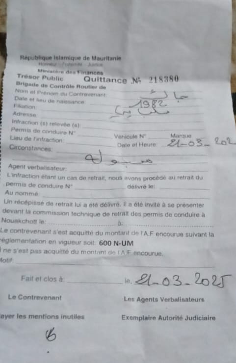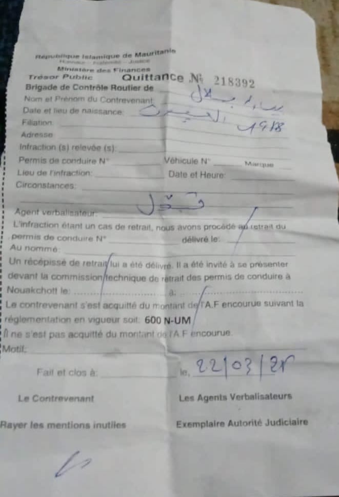 وتجدر الإشارة إلى أن هذا يدخل في إطار حملة شنتها إدارة الأمن الوطني، ابتداء من مساء الأربعاء 19 مارس، على المتسولين، خاصة على مستوى انواكشوط الغربية، وبالتحديد تقاطعات الطرق الرئيسية بمقاطعتي تفرغ زينه ولكصر، فكانت مفوضيات هاتين المقاطعتين مسرحا لتوقيف العديد من المعاقين حركيا، ومن الصم والمكفوفين من الرجال والنساء، وفي ظروف يرثى لها، بل إن هذه المفوضيات اشترطت على هؤلاء المتسولين دفع غرامة 6000 أوقية قديمة، مقابل ممارسة التسول، فقام البعض بدفعها لفرقة المراقبة الطرقية بالمفوضية (انظر المخالصات المرفقة)، ليتم إطلاق سراحه، بينما امتنع البعض الآخر عن دفع ما اعتبره ضريبة مقابل ممارسة التسول، وسابقة من نوعها قد تصبح مع مرور الوقت إجبارية الدفع.