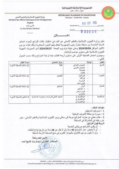 وزارة الشؤون الإسلامية والتعليم الأصلي تفتح مجال استقبال ملفات المترشحين لجائزة رئيس الجمهورية لحفظ وفهم المتون المحظرية