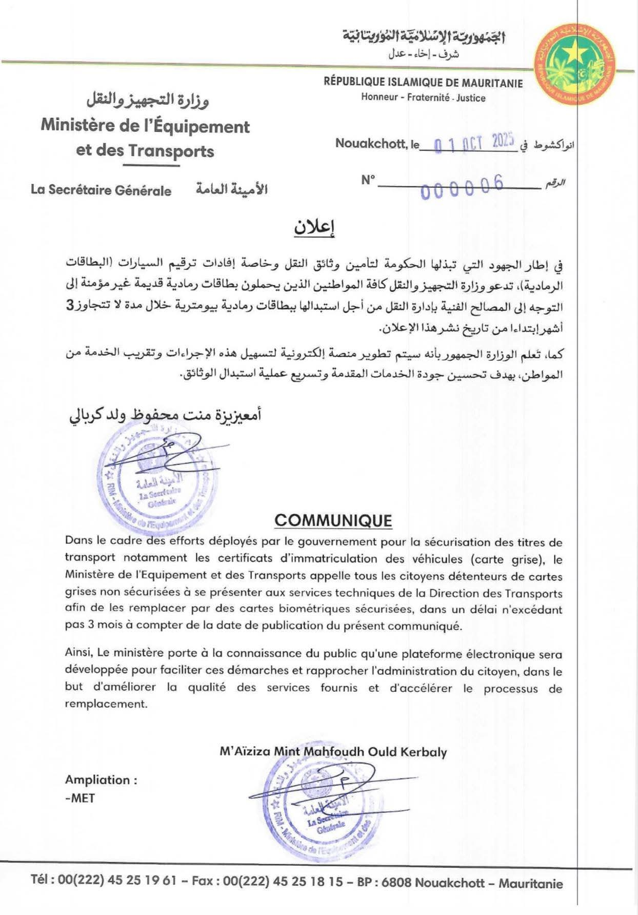 دعت وزارة التجهيز والنقل إلى استبدال البطاقات الرمادية غير المؤمنة ببطاقات رمادية بيومترية خلال ثلاثة أشهر.