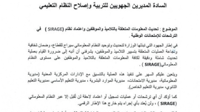 دعت وزارة التربية وإصلاح النظام التعليمي، المديرين الجهويين إلى تحديث معلومات التلاميذ والموظفين واعتماد نظام (سراج) في الترشحات للامتحانات الوطنية.…